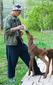 В середине апреля лосей переводят в «демонстрационный» загон площадью около 4 га. И только беременных лосих, как говорилось выше, помещают отдельно, в «родильный» загон площадью около 3 га.