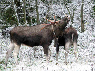 Когда лосиха сыта, она спокойно ожидает начало родов и только за один-два дня начинает беспокоиться. Сотрудники лосефермы пристально следят за состоянием готовых к отелу животных.